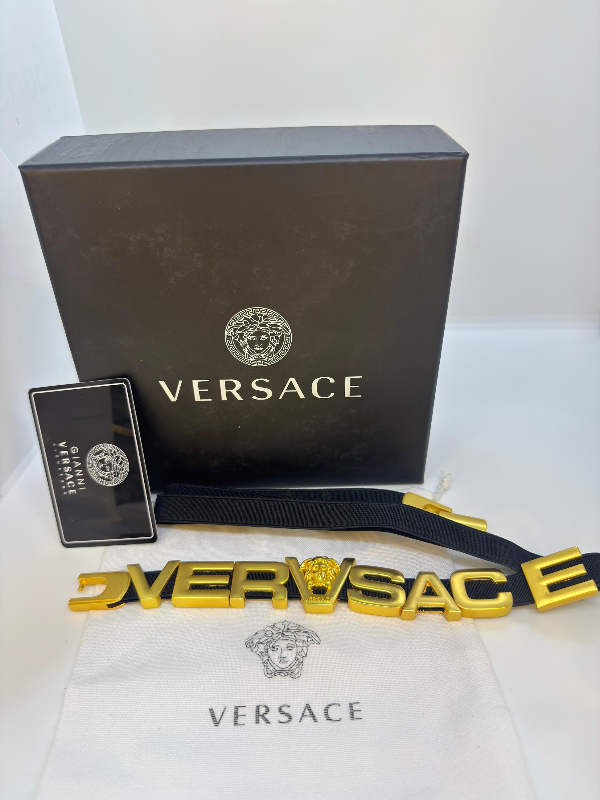 Elevate your style with this luxurious" Versace belt". Crafted in sleek black with a bold gold-tone buckle featuring the iconic Medusa logo, it delivers a statement of elegance and sophistication. Perfect for both daily wear and special occasions, this belt combines practicality with timeless luxury.