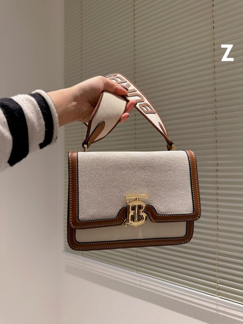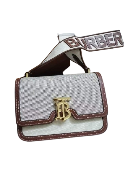 The "Burberry Canvas TB Bag" blends timeless elegance with modern style. Crafted from refined canvas with brown leather trims and signature gold-tone hardware, it’s finished with the iconic TB monogram clasp. The wide Burberry-logo strap adds both comfort and a chic statement, making it perfect for everyday wear.