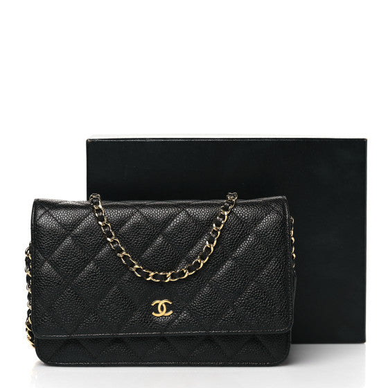 The Chanel Classic Caviar bag in black with iconic quilted design and gold-tone chain. A timeless, elegant piece perfect for both daily wear and special occasions.