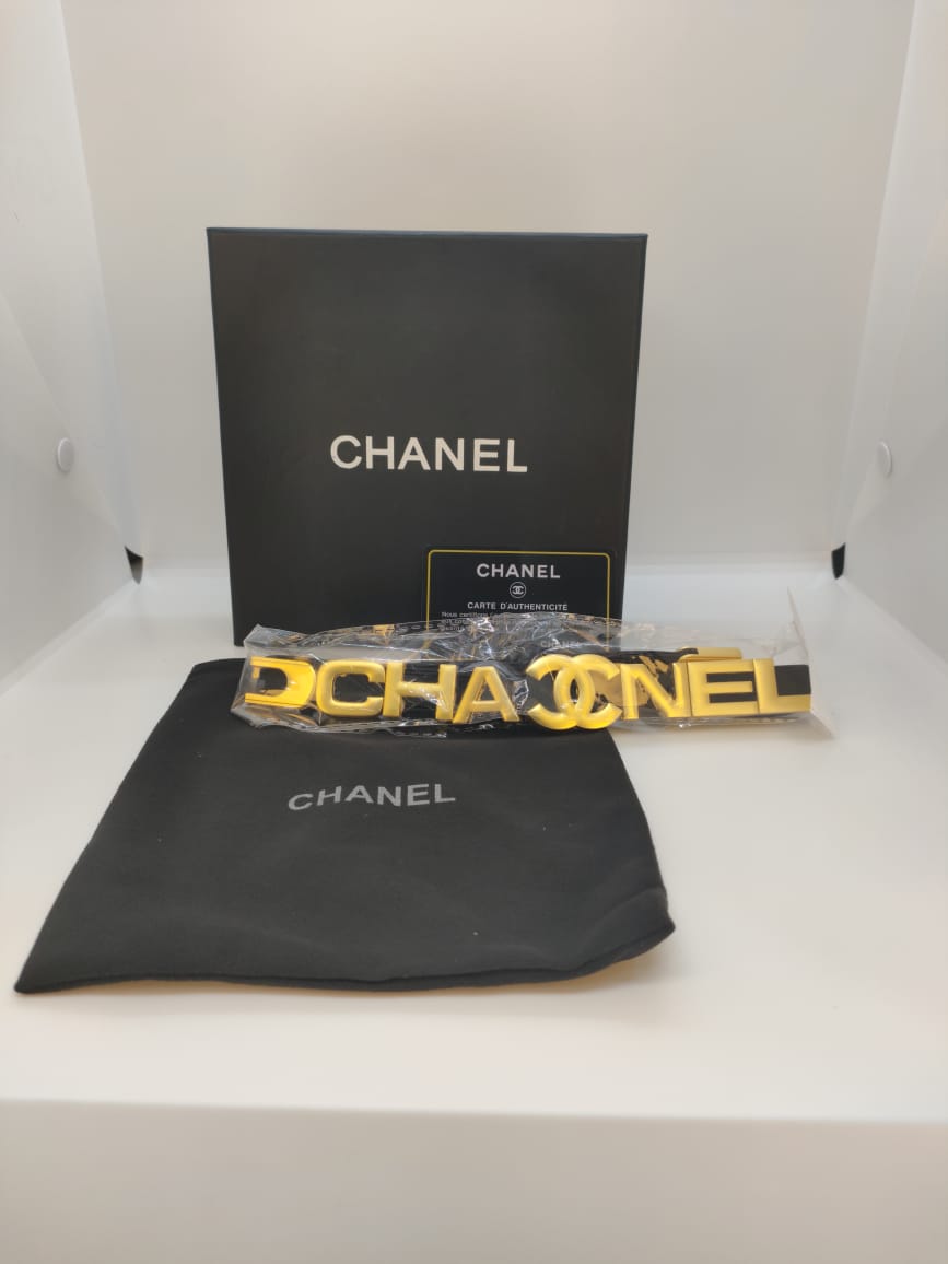 A statement Chanel belt in sleek black leather, featuring bold gold “CHANEL” letters and the iconic interlocking CC logo. A timeless accessory that adds elegance and edge to any outfit.