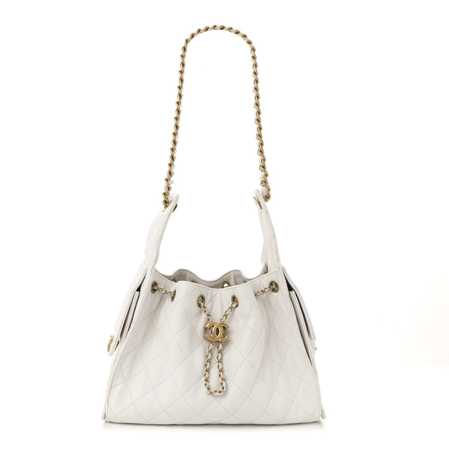 The handbag in the image appears to be the Chanel 25 medium hobo bag in white quilted leather with gold-tone metal hardware. It features a distinctive drawstring chain closure and two exterior side pockets.