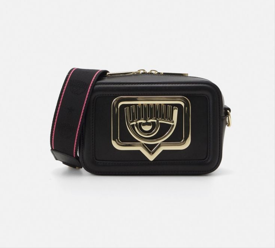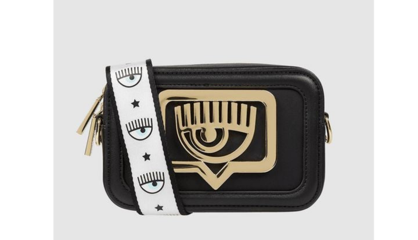 A statement crossbody by Chiara Ferragni, featuring the signature bold eye logo with a striking gold frame. Comes with a playful wide strap for a trendy, standout look.