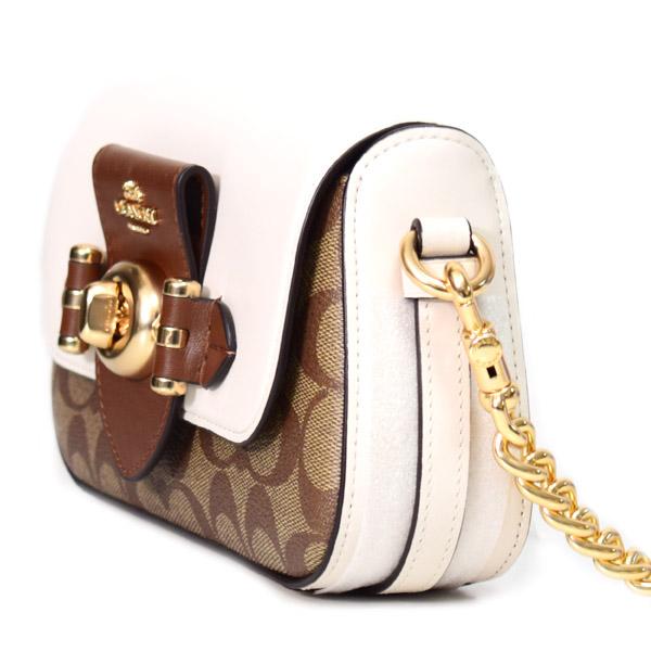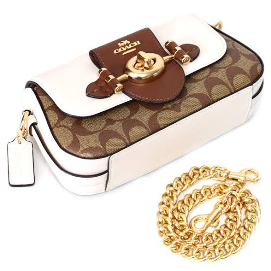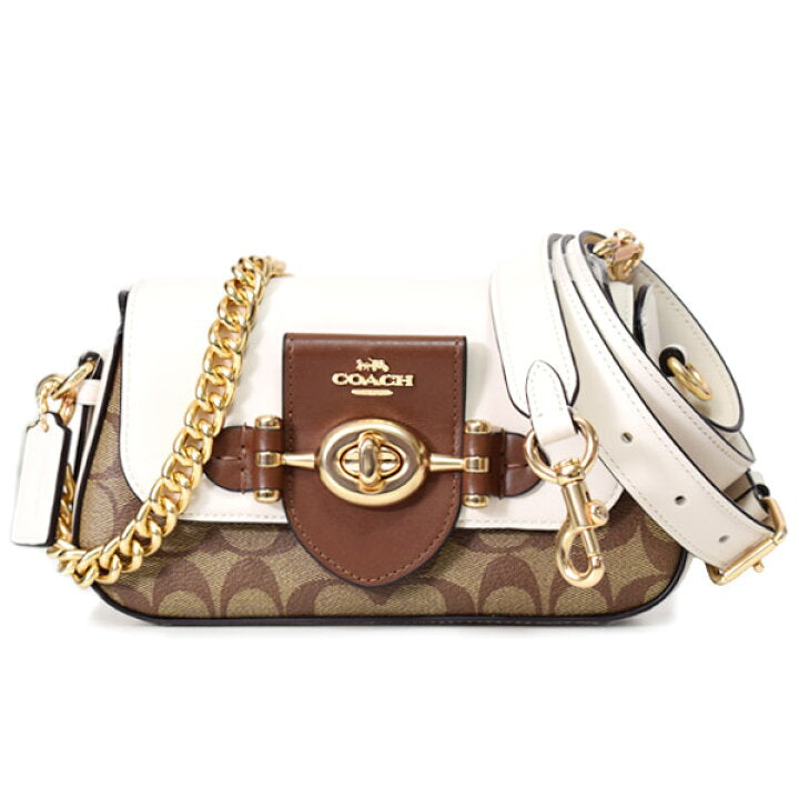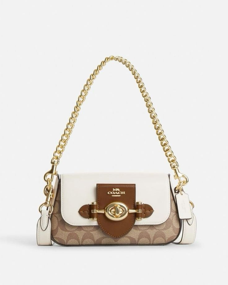 Elegant Coach clutch, blending brown, white, and signature monogram canvas with a golden turn-lock and chic chain — a perfect balance of casual and timeless style.