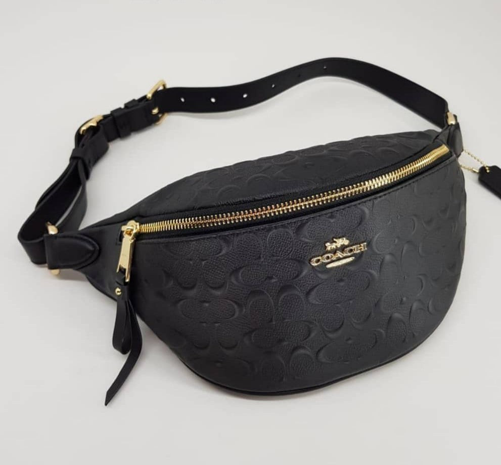 The Coach Edge bag in sleek black features the iconic embossed pattern, offering a stylish yet functional design perfect for travel and everyday wear.
