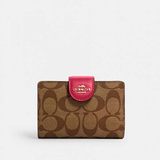 A stylish Coach wallet featuring the classic brown monogram design, accented with a modern pink leather tab closure. Perfectly blends elegance and functionality for everyday use.