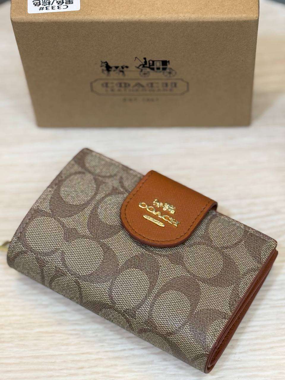 Chic Coach wallet in the signature monogram print, accented with a coral flap closure for a vibrant touch. Compact yet practical — perfect for cards and cash in style.