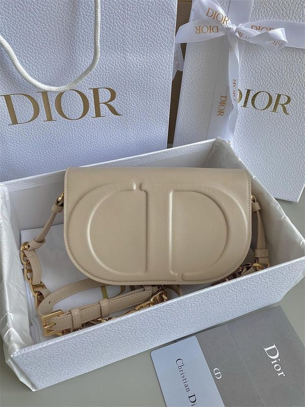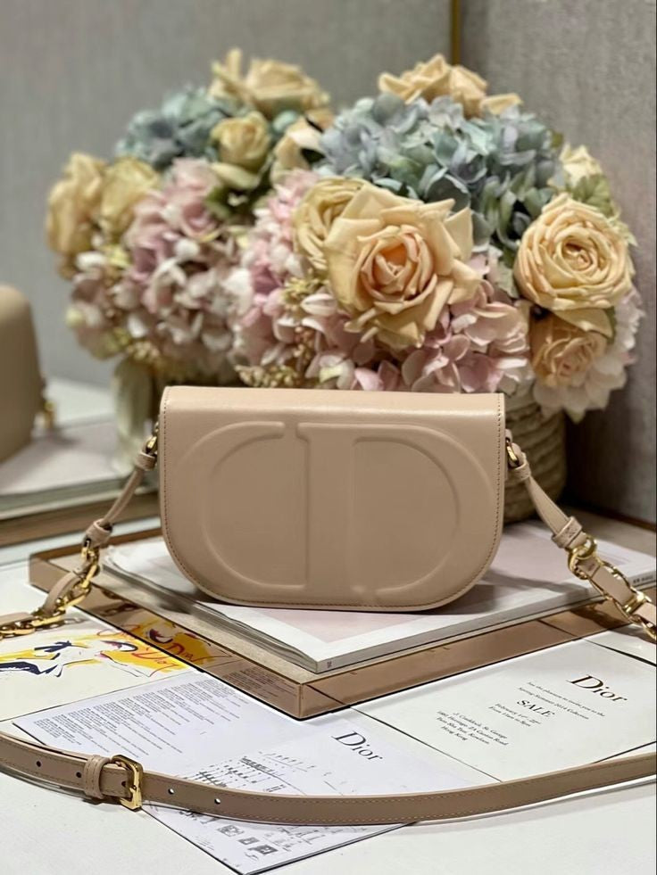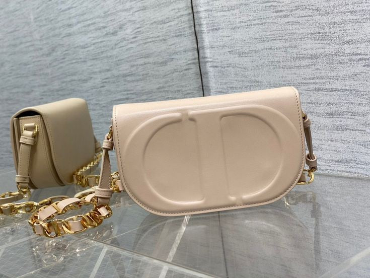 A sophisticated shoulder bag crafted in smooth beige box calfskin, featuring the iconic embossed "CD" signature. Its structured silhouette and adjustable strap make it a versatile piece, perfect for both everyday elegance and special occasions.