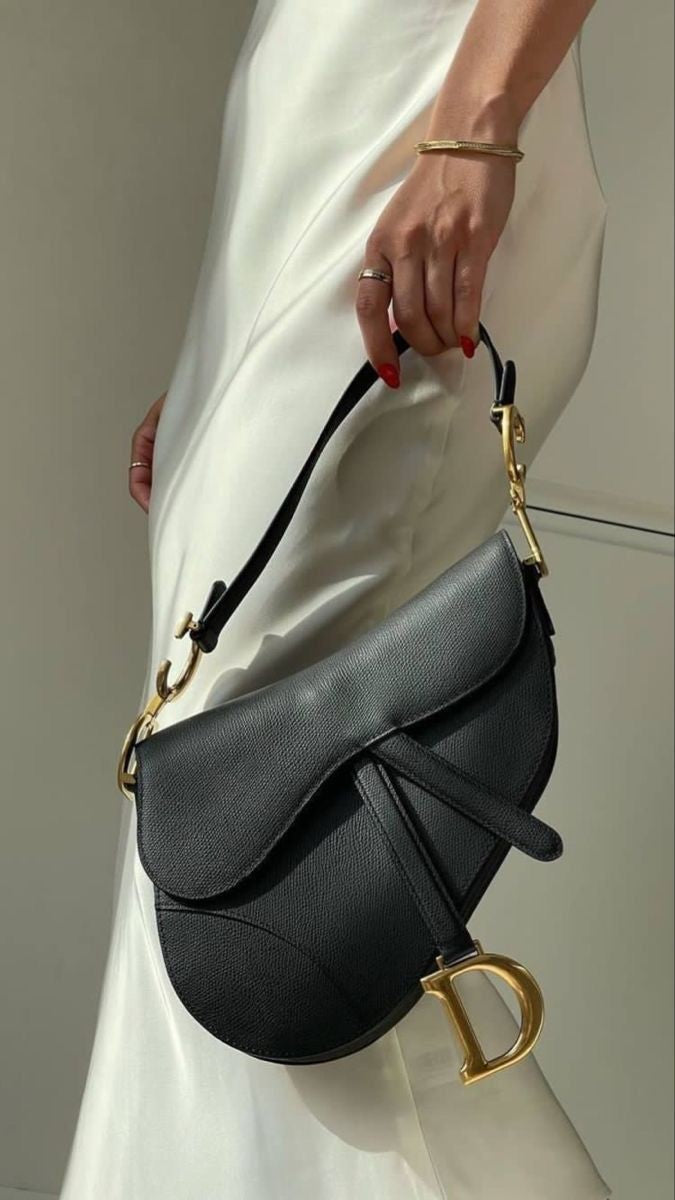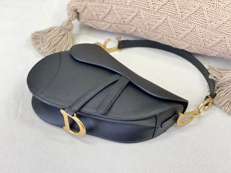 The iconic Dior Saddle Bag is reimagined in timeless black leather, enhanced with gold-tone hardware. Featuring the signature “D” stirrup magnetic clasp and saddle flap, this masterpiece combines heritage with modern elegance. Perfect for shoulder or hand styling.