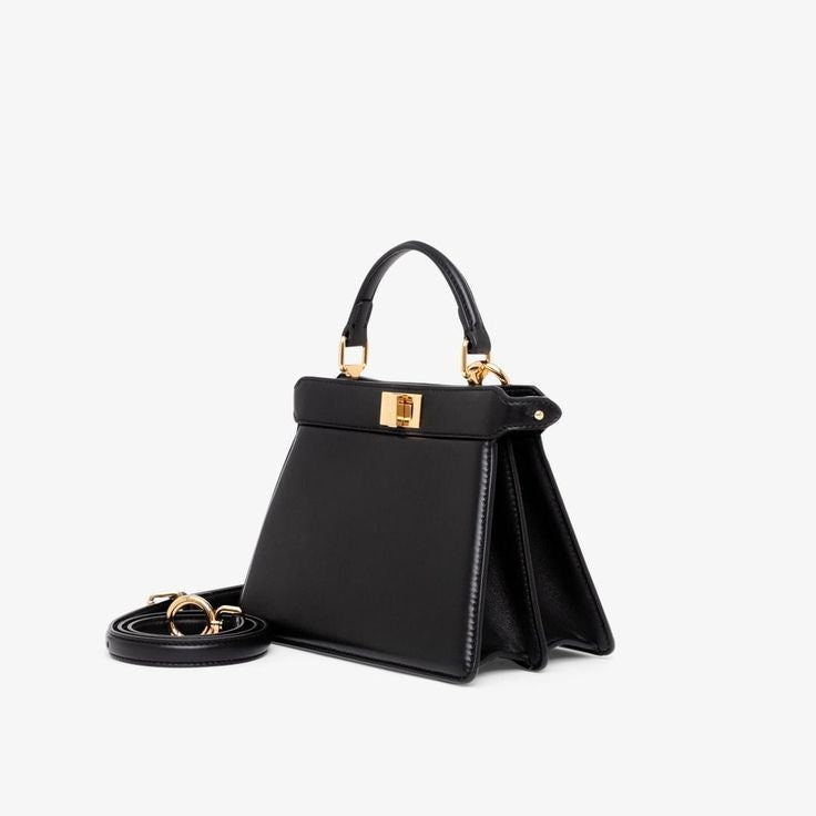 Iconic structured handbag crafted from smooth black leather, detailed with a gold-tone twist lock for timeless elegance.