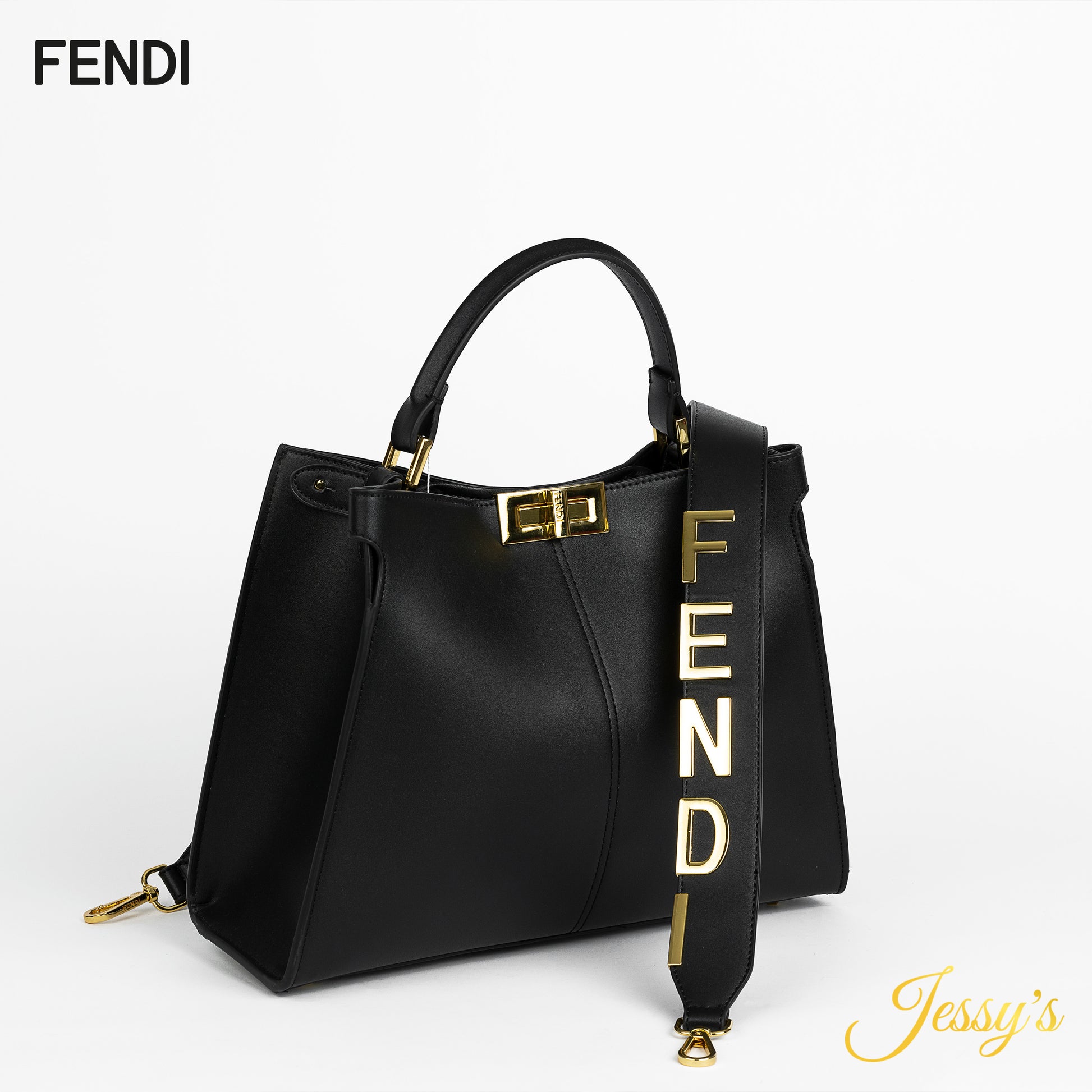 Elegant medium Peekaboo bag in smooth black leather, detailed with gold-tone twist lock and top handle, offering a timeless and versatile design.