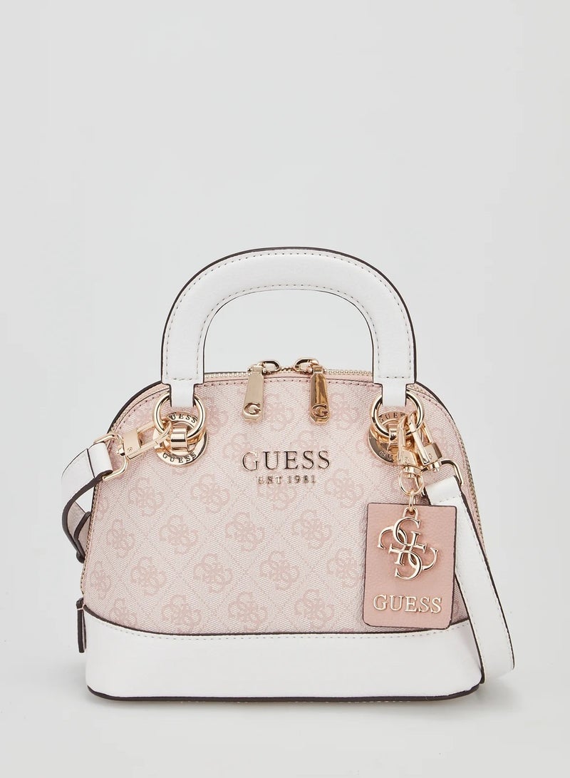 Elegant pink and white handbag with monogram print, gold-tone hardware, and detachable charm. Perfect for a chic and feminine look.