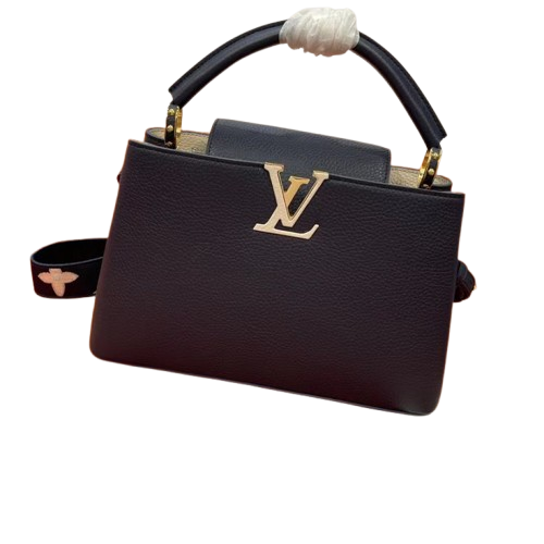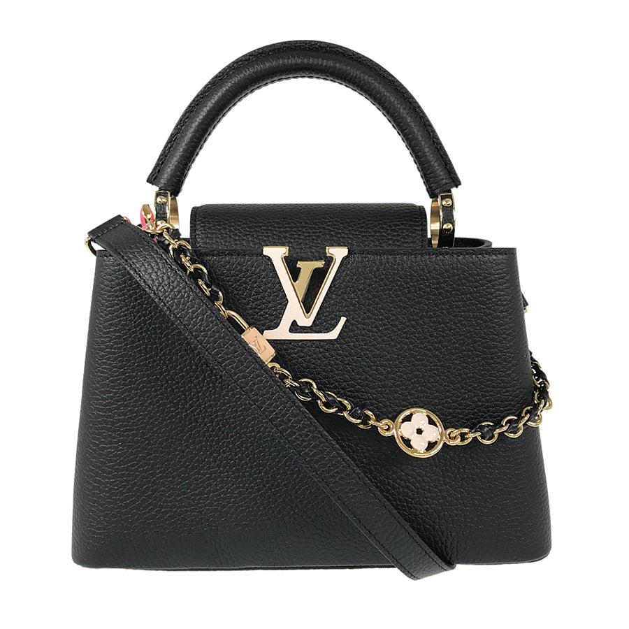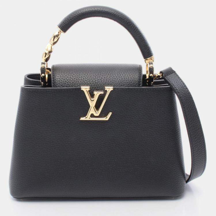 The Louis Vuitton Capucines bag in black grained calf leather is a timeless icon of elegance. Adorned with gold-tone hardware and the signature LV initials, it features a structured silhouette with a top handle, detachable strap, and decorative chain. Perfect for both day and evening wear, it combines luxury with versatility.