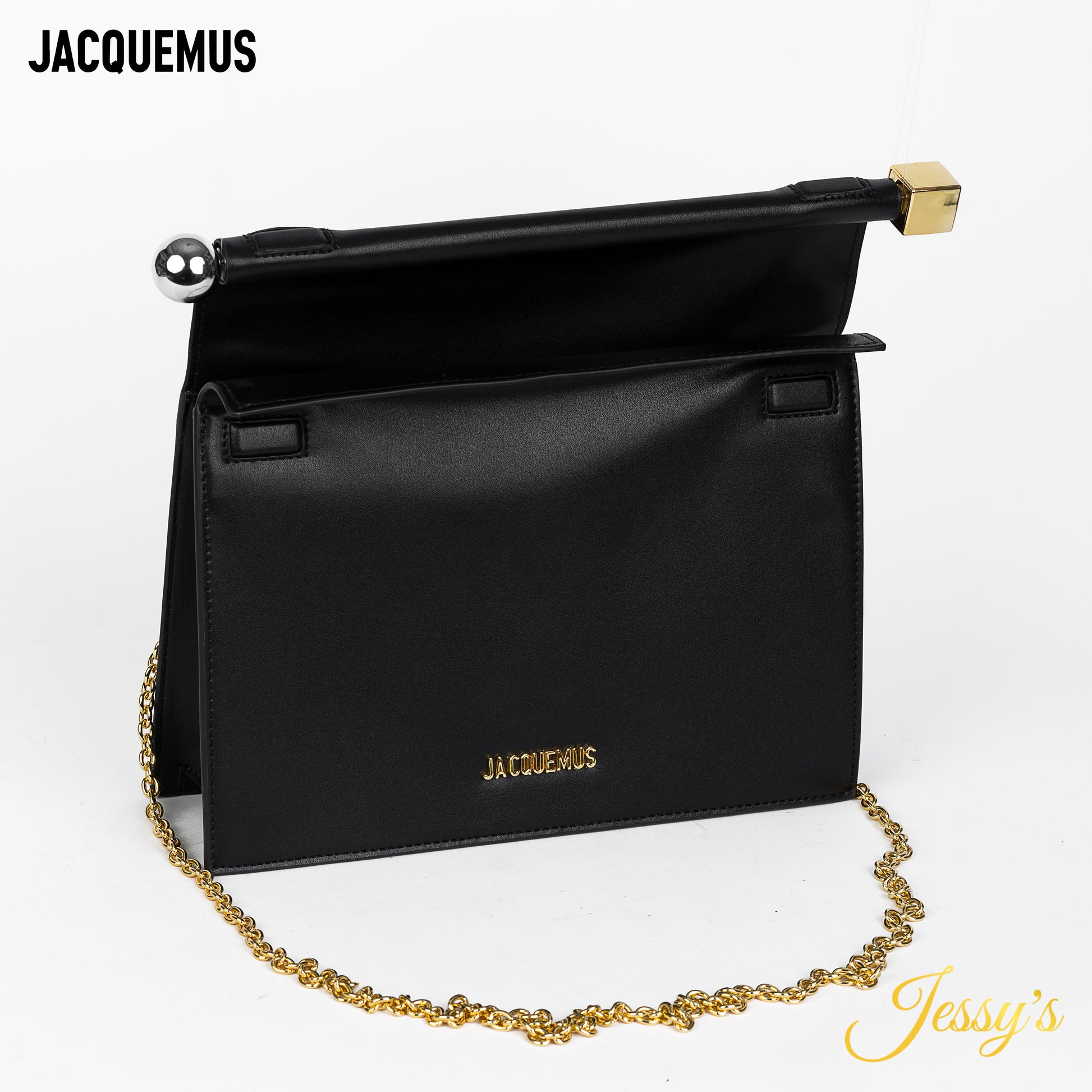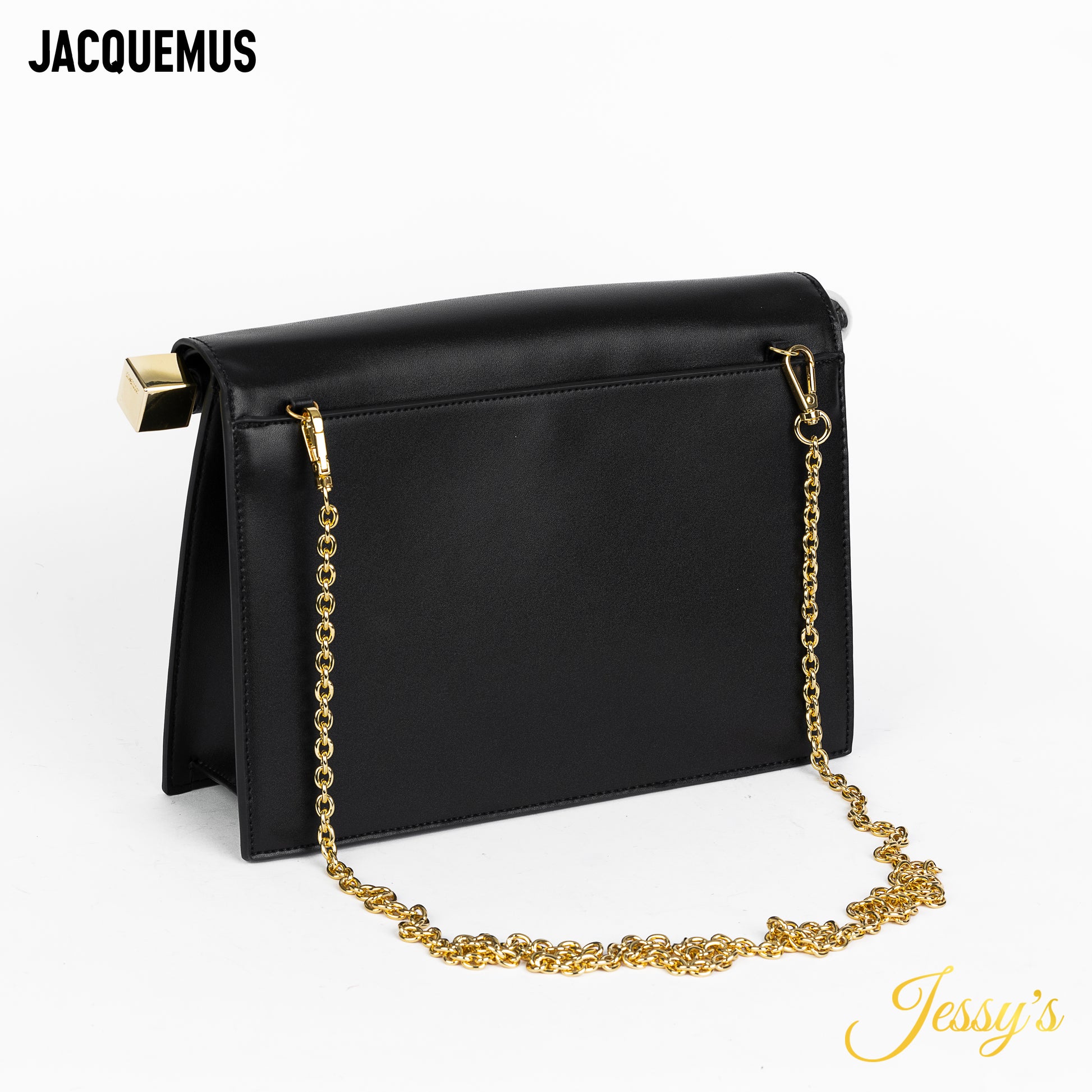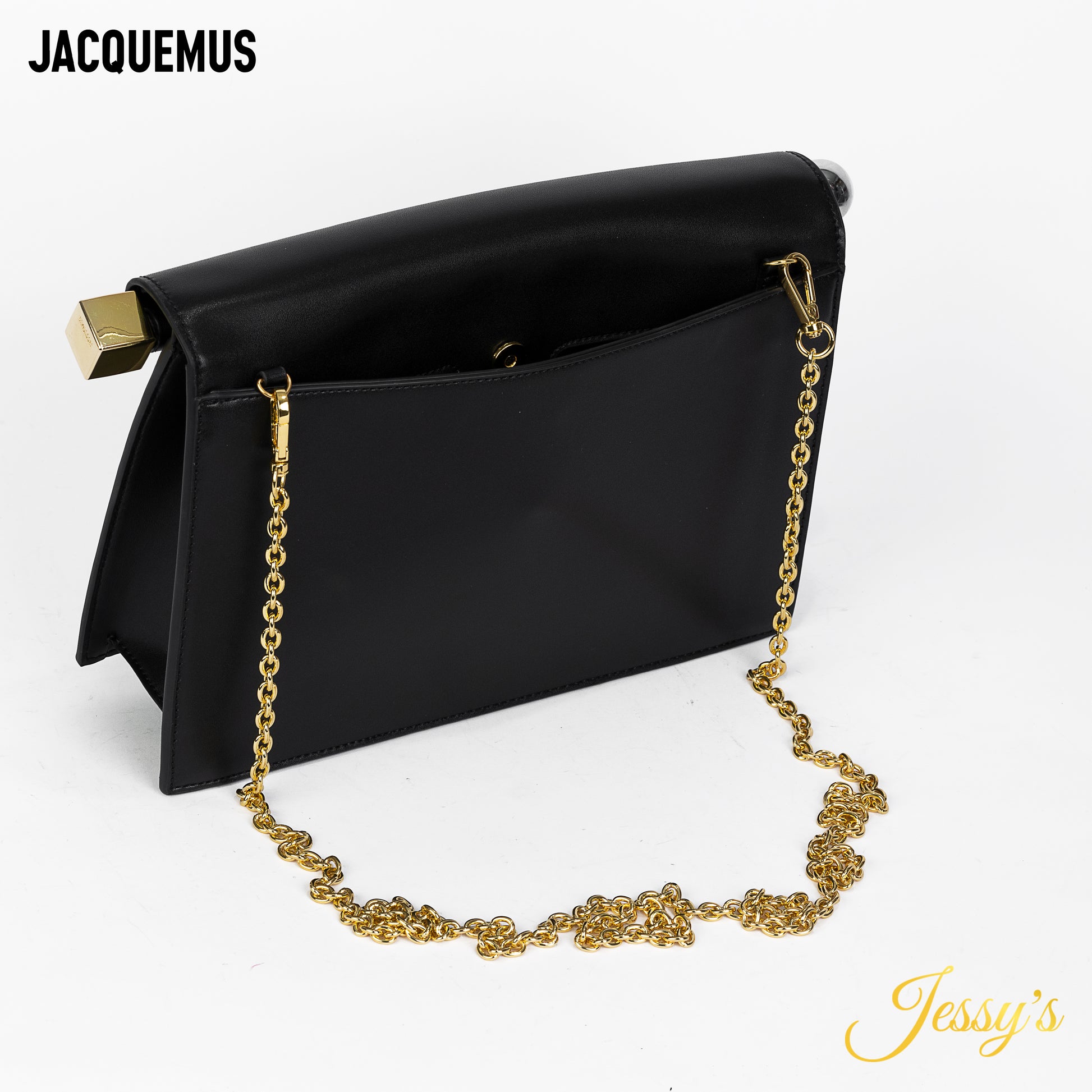 A chic clutch bag from Jacquemus that blends minimal elegance with luxury. Designed in timeless black with a golden chain detail, making it the perfect statement piece for evenings and special occasions.
