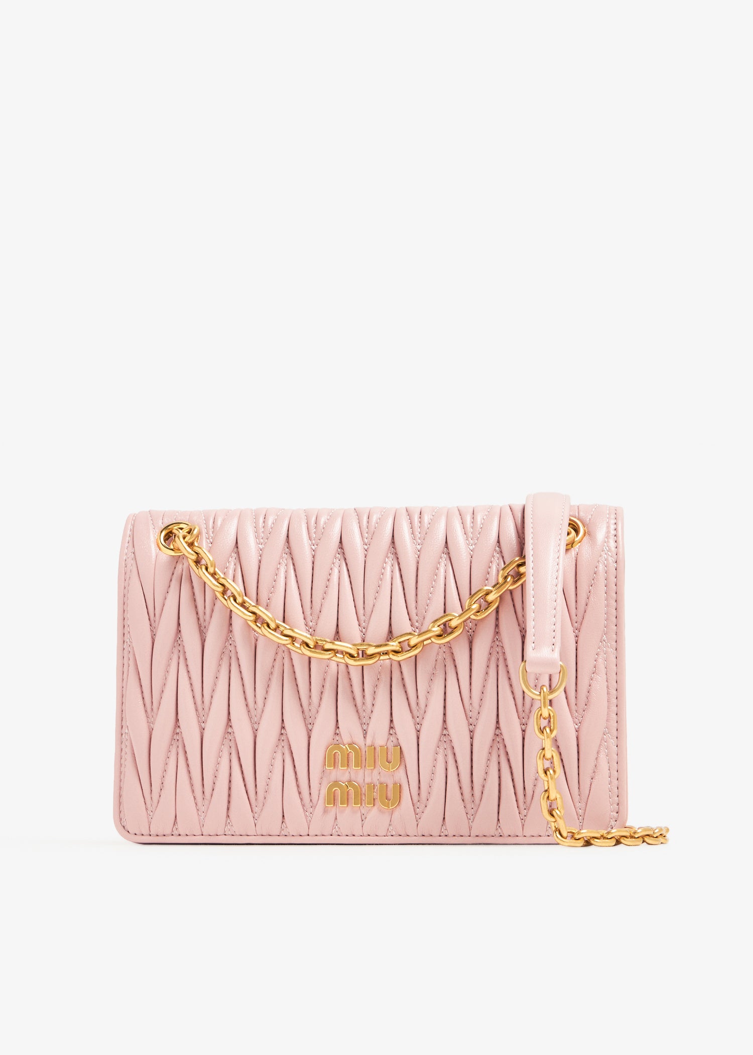 Soft pink leather handbag with the signature matelassé design and an elegant gold chain strap, adding a feminine and chic touch.