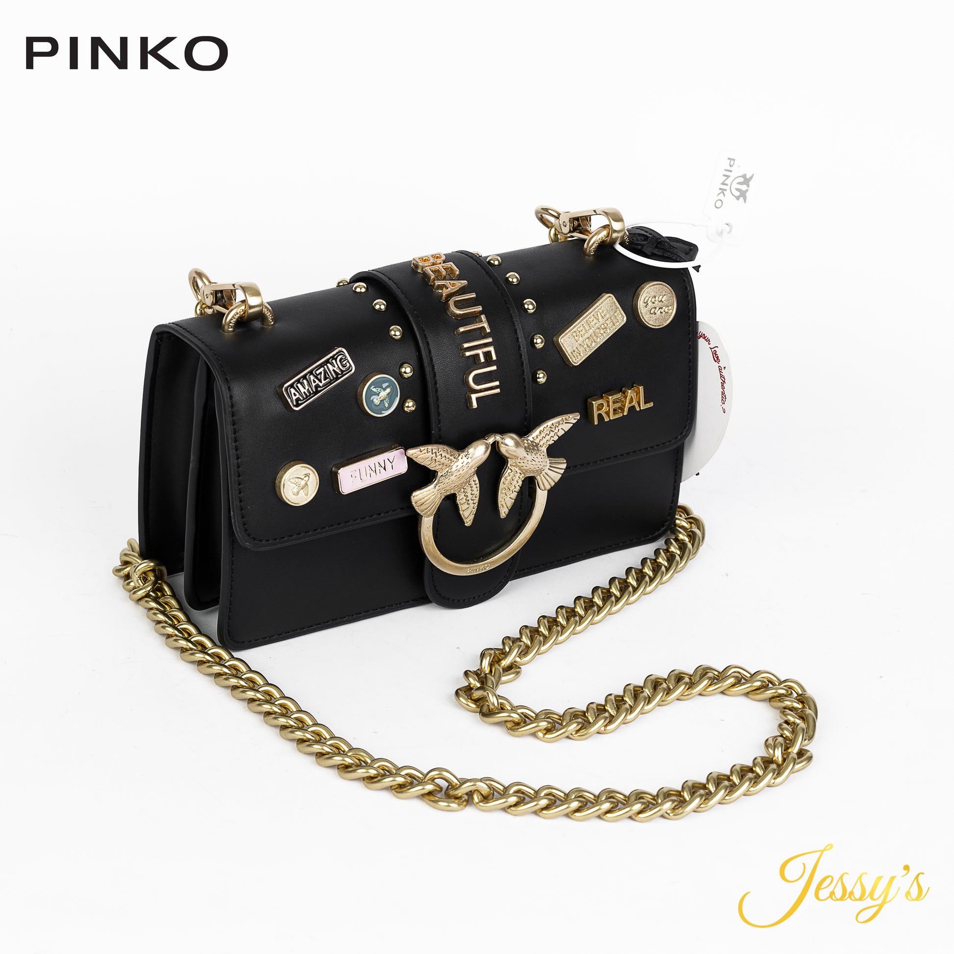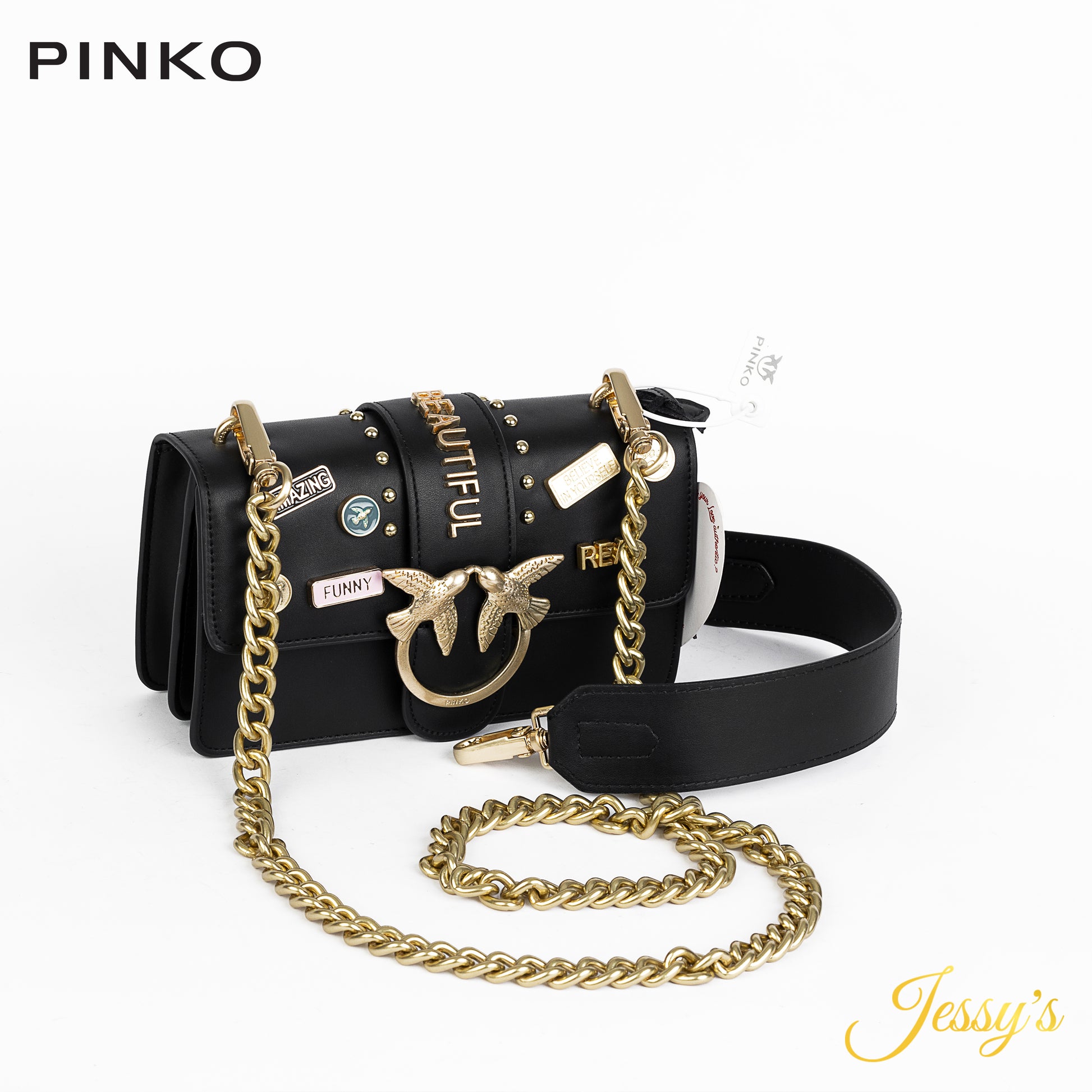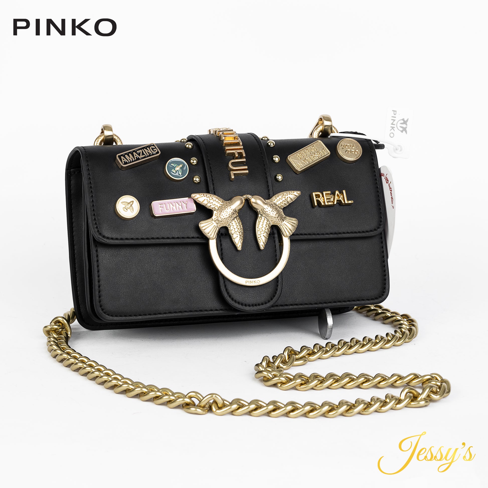 Add a playful twist to your style with the PINKO Love Bag Icon Patch in black leather. This bold design features statement pins and badges that celebrate individuality, all highlighted by the signature Love Birds gold buckle at the front.