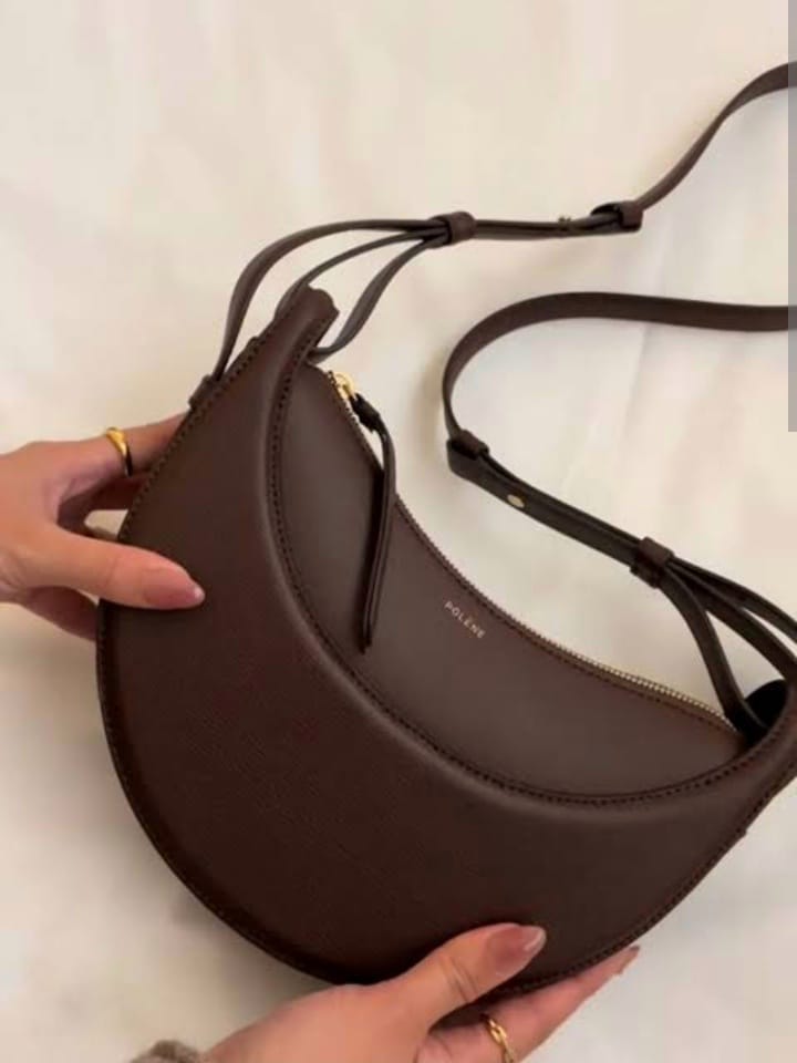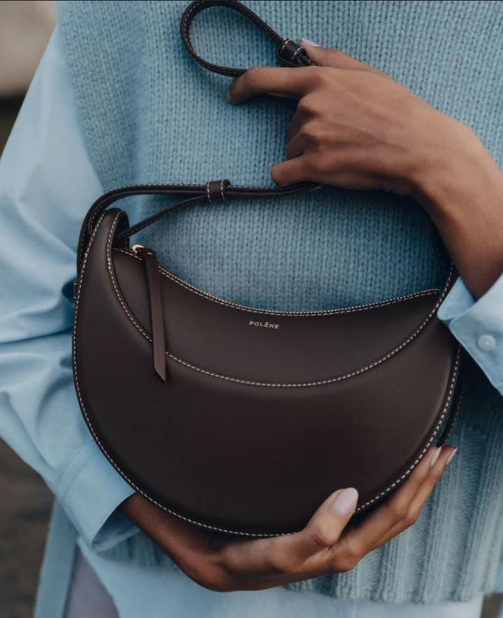 The handbag in the image is the Polène Numéro Dix (Number Ten) in a brown shade, likely "Cognac" or "Sandalwood". It's a popular crescent-shaped shoulder or crossbody bag known for its distinctive rounded form, foam padding, and hand-stitching.