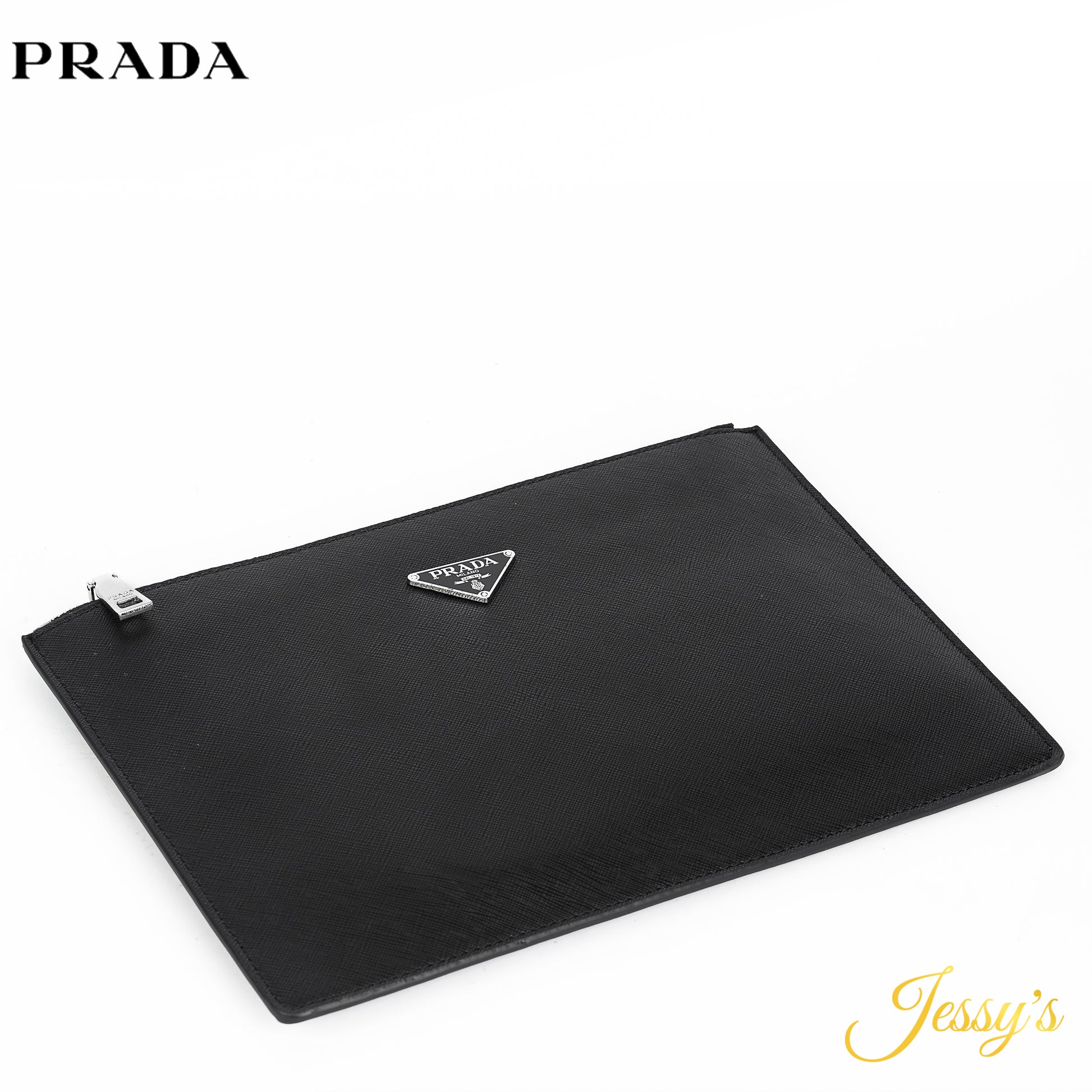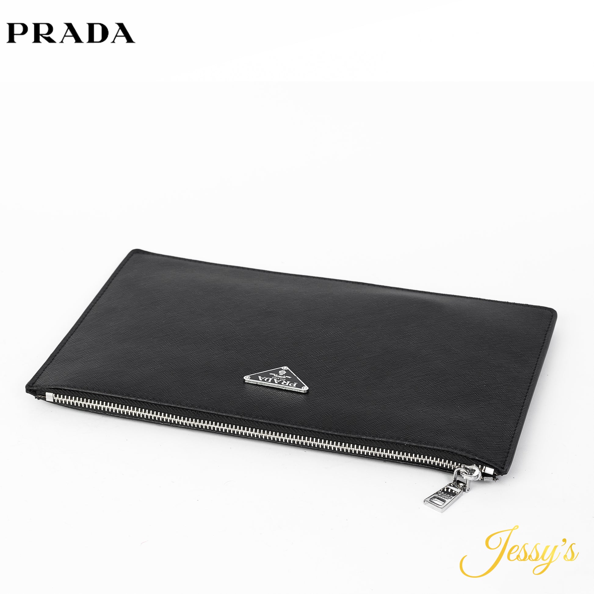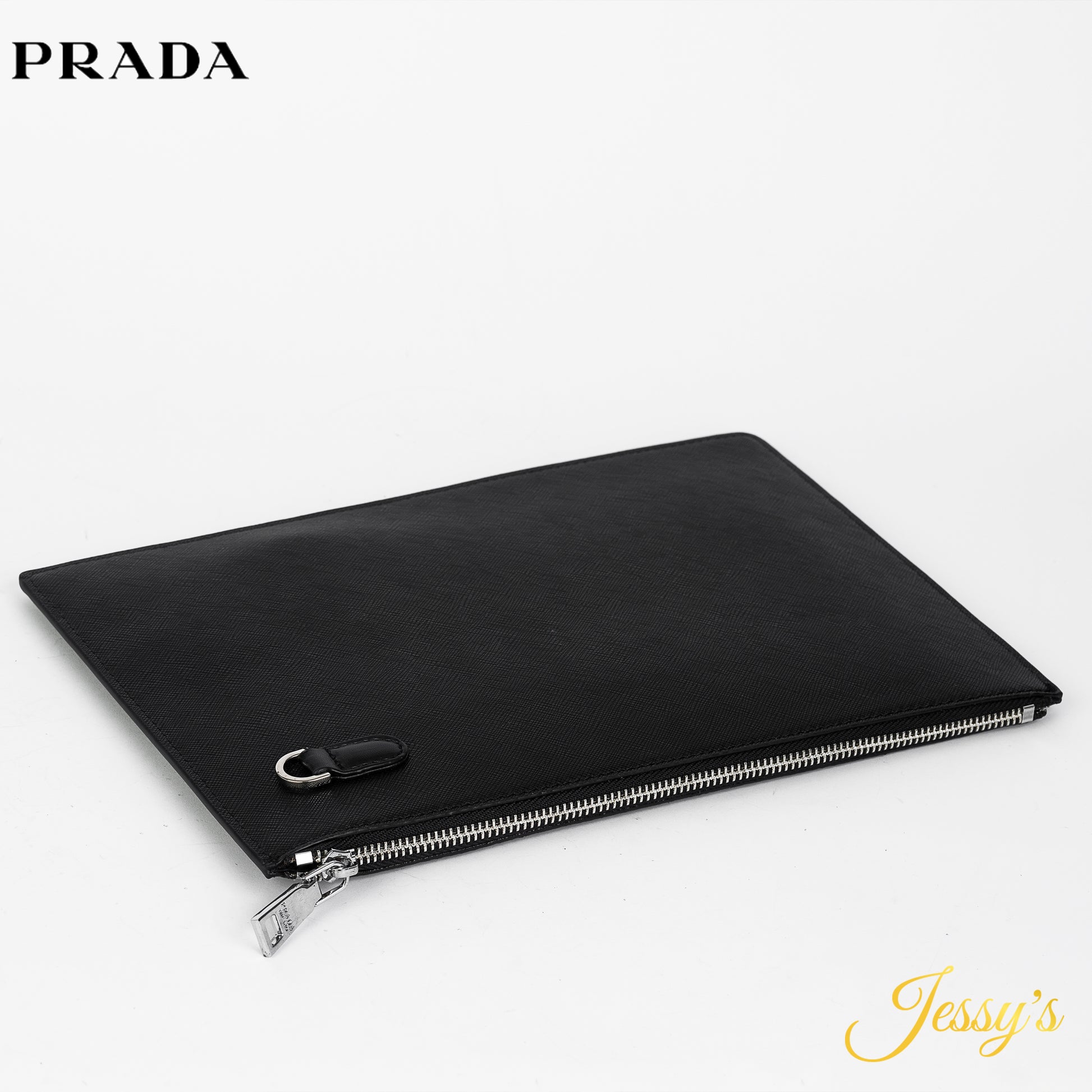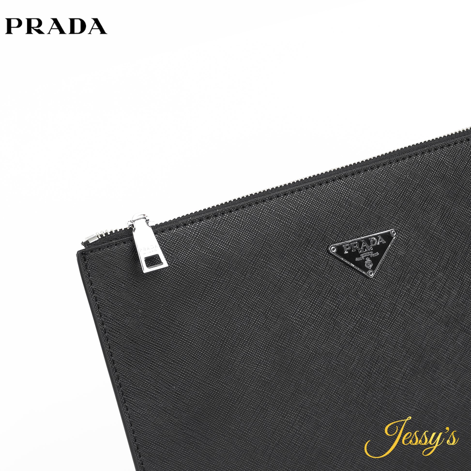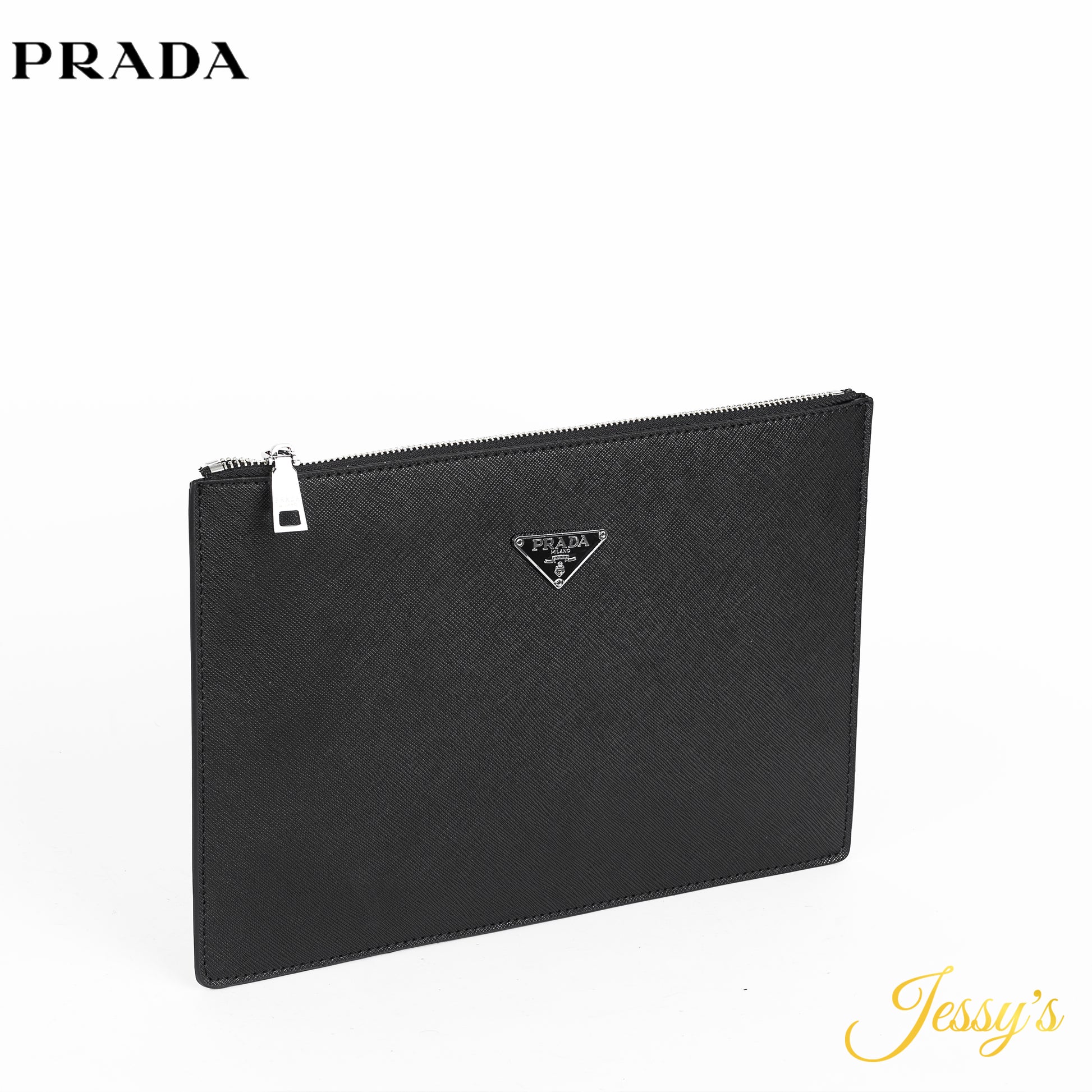 Elegant Prada clutch crafted from premium black Saffiano leather. Features a sleek design with top zip closure and the iconic Prada metal logo. A timeless and versatile piece, perfect for both daily and formal looks.
