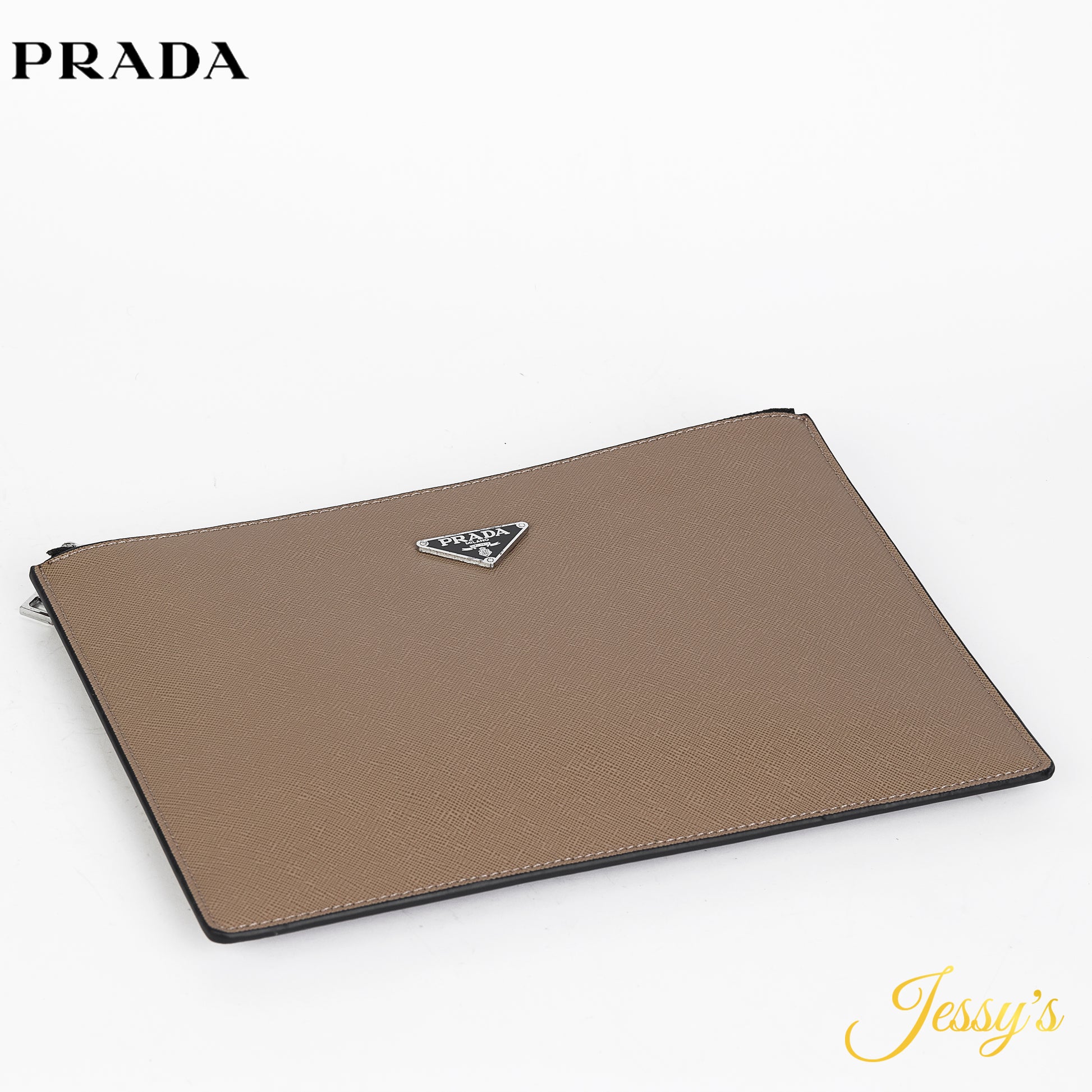 Elegant Prada pouch crafted from saffiano taupe leather, featuring the iconic silver Prada Milano triangle logo. Sleek and practical, perfect for carrying essentials with style.