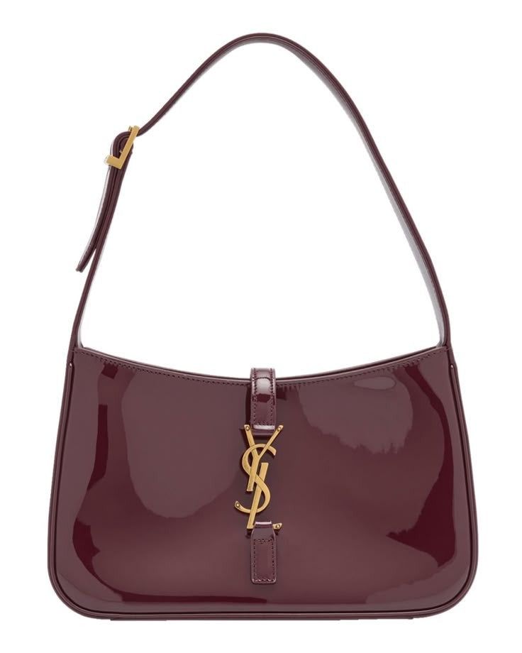 Crafted from glossy patent leather in a rich burgundy tone, this shoulder bag features the iconic gold YSL monogram. Its sleek silhouette and adjustable strap make it the perfect piece for day-to-night elegance.