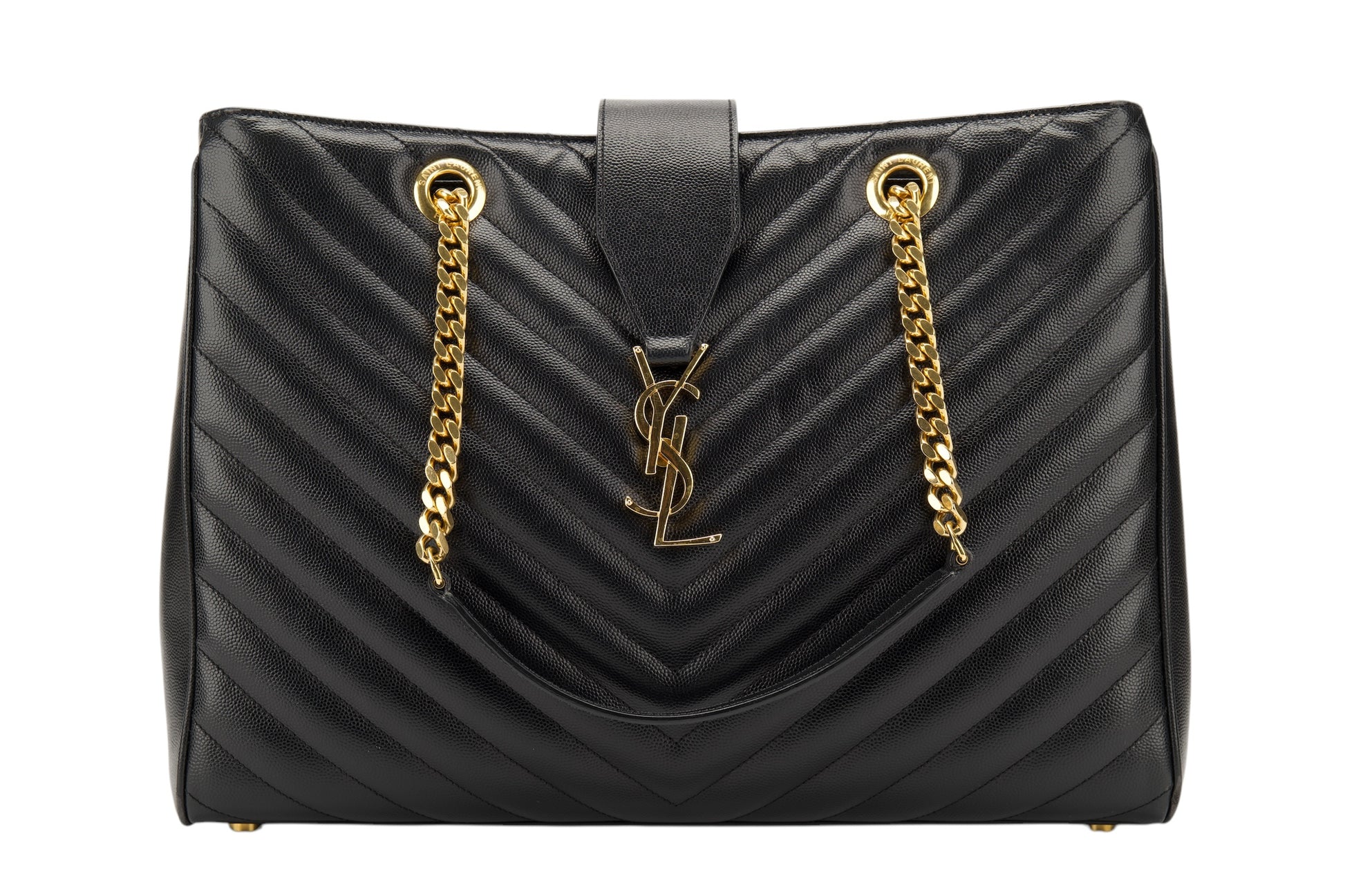 A spacious and elegant tote crafted from black quilted leather with chevron stitching. Features the iconic gold YSL monogram, dual chain straps, and magnetic closure for a chic yet functional everyday style.