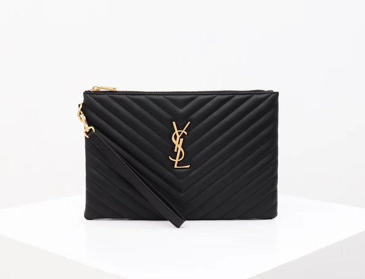 A sleek and elegant Saint Laurent pouch crafted from quilted black leather, featuring the iconic YSL gold-tone logo. Designed with a secure zip closure and a detachable wrist strap for versatile styling. Perfect for evenings, special occasions, or as a chic organizer inside a larger bag.