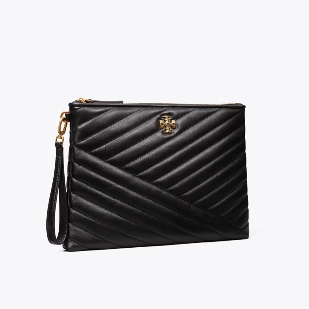 A sleek Tory Burch clutch in classic black, crafted from luxurious quilted leather with a diagonal pattern, featuring a gold-tone zipper and signature logo for a chic, elegant evening look.