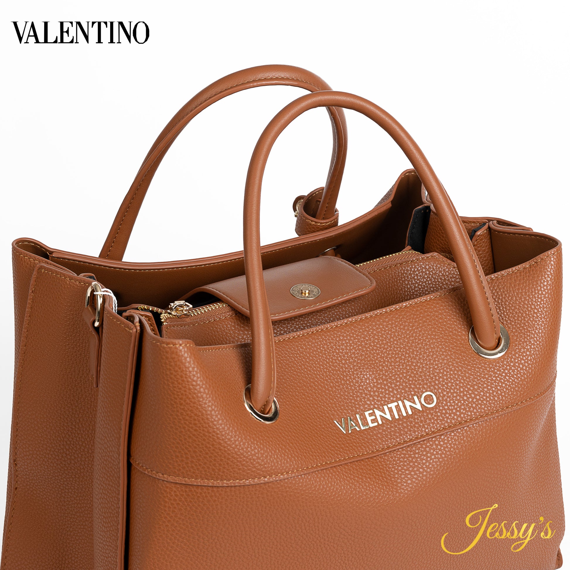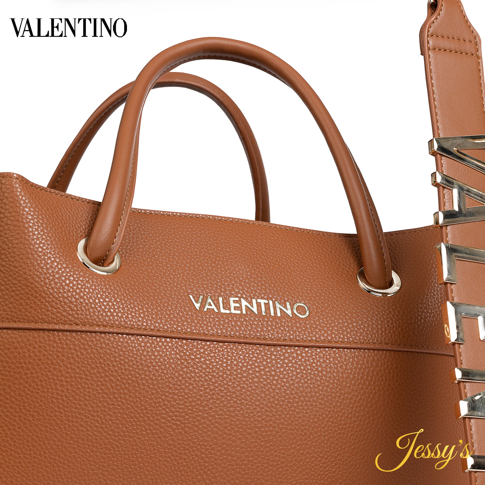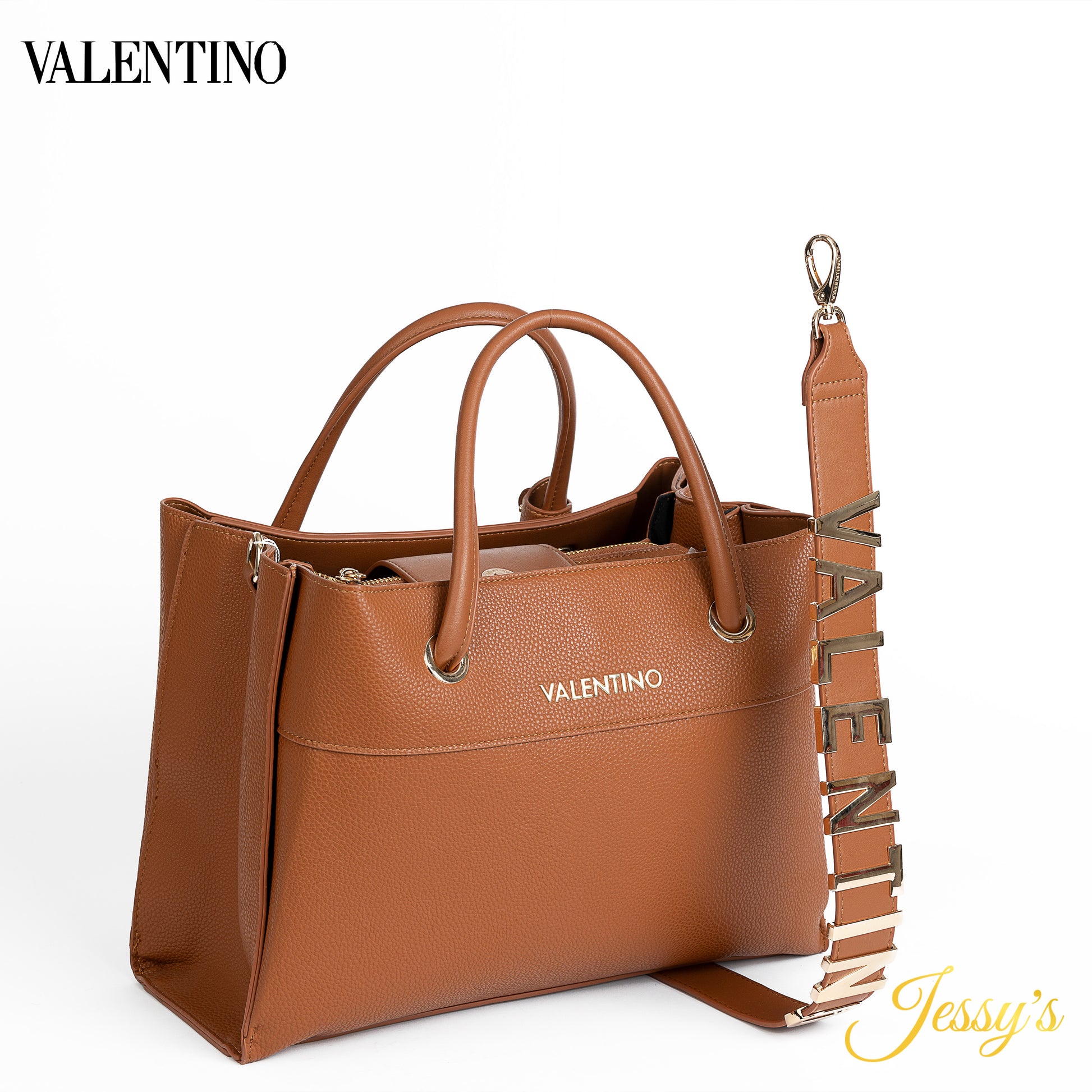A sophisticated Valentino tote bag crafted from premium brown leather, featuring a spacious design, sturdy top handles, and the signature Valentino gold logo. Perfect for stylish everyday wear.
