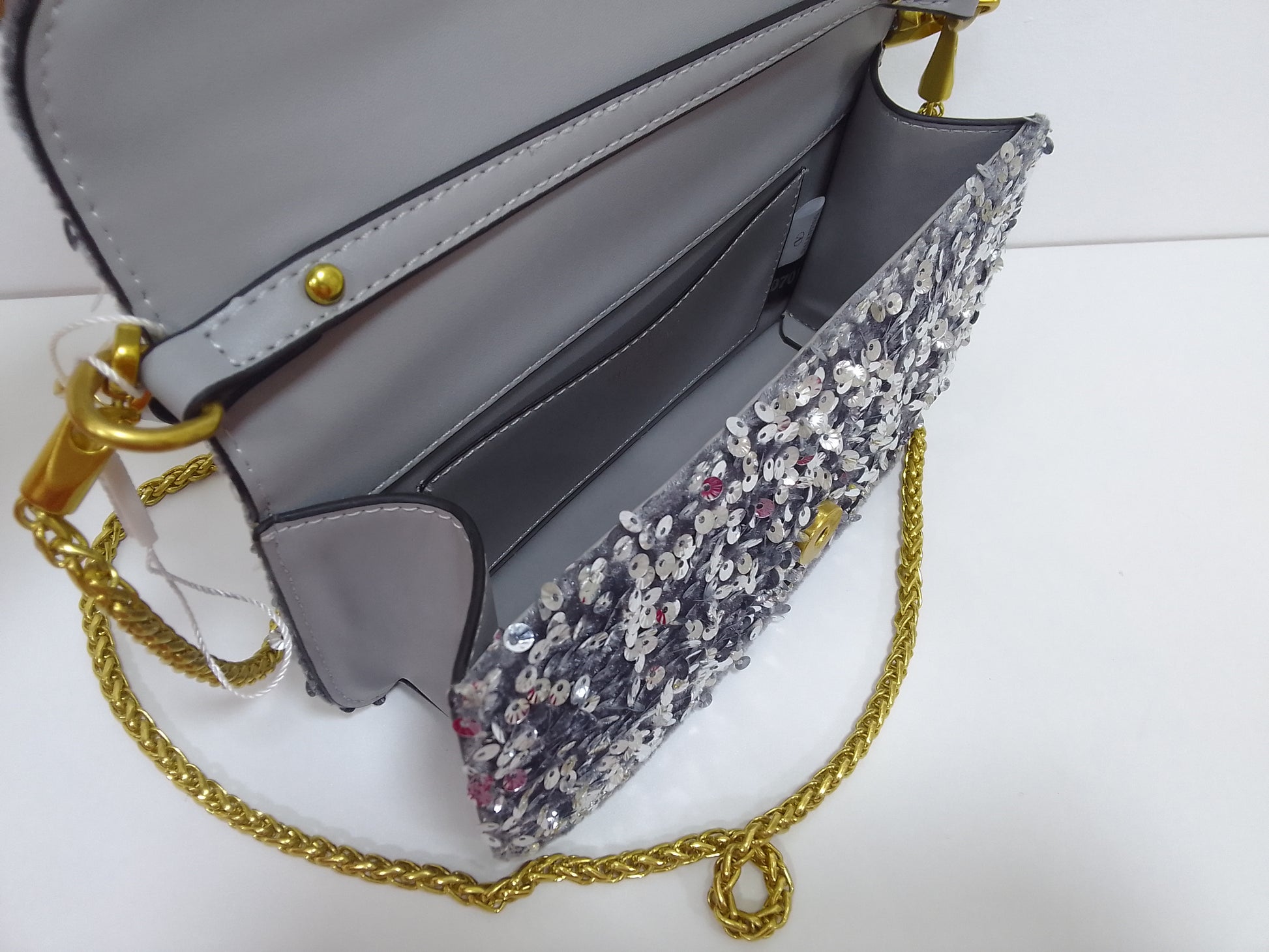 A luxurious Valentino evening bag adorned with shimmering silver sequins, featuring a gold-tone chain strap and signature V buckle, perfect for elegant occasions and special events.