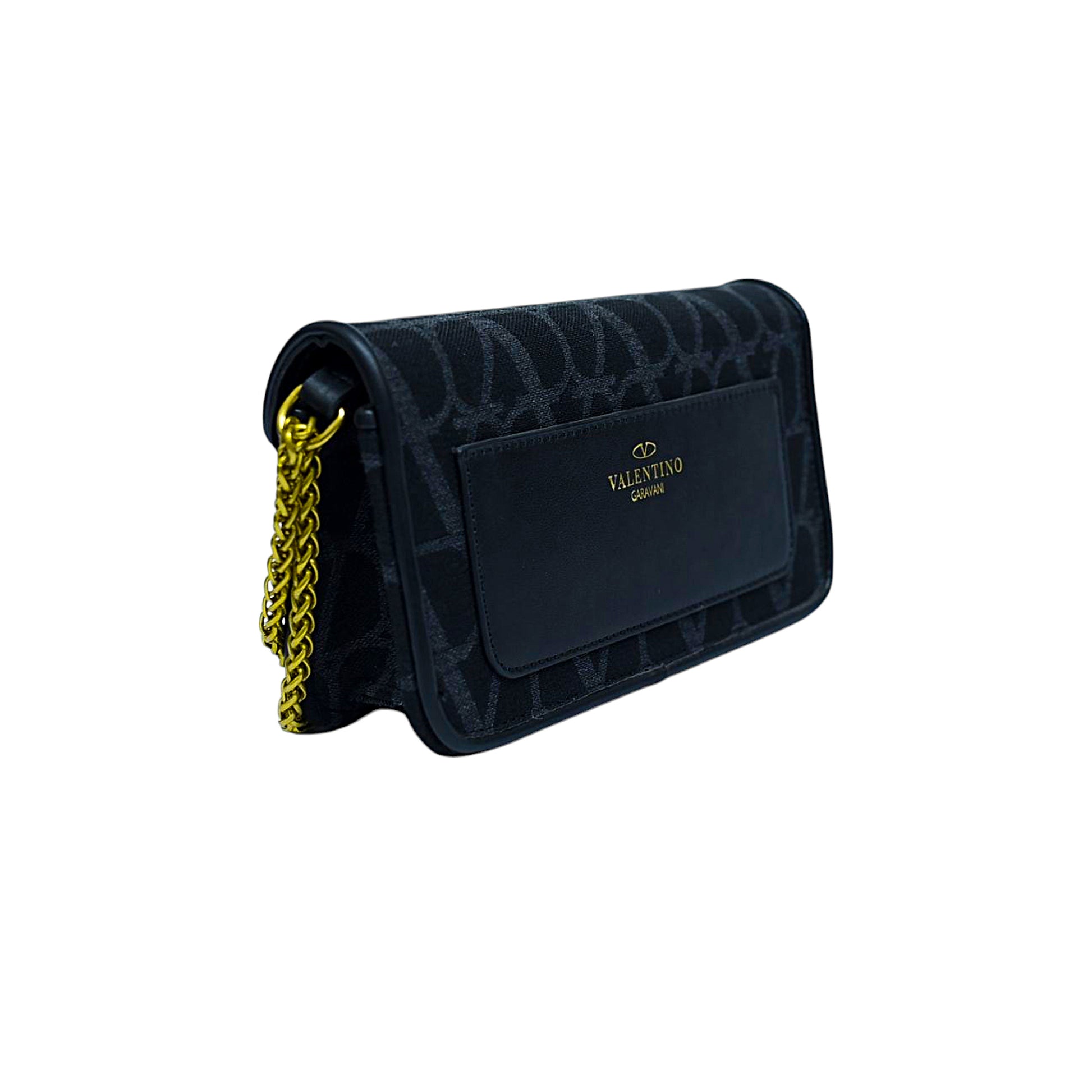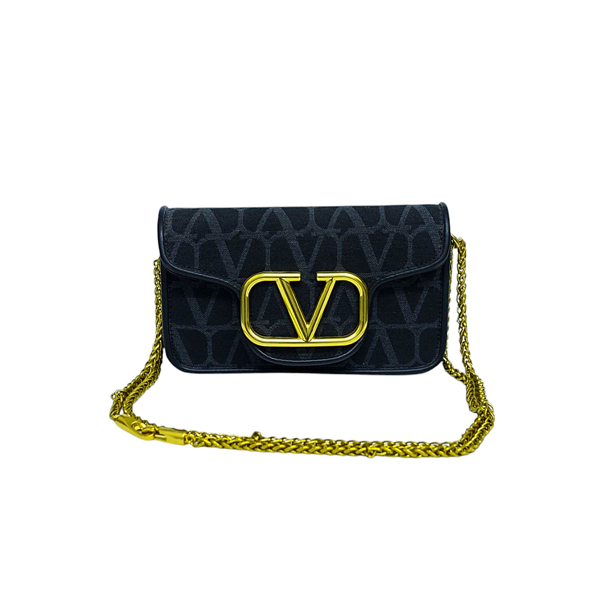 A stylish Valentino shoulder bag in black with the iconic V logo pattern, featuring a gold-tone chain strap and signature metallic buckle, perfect for evenings and chic looks.