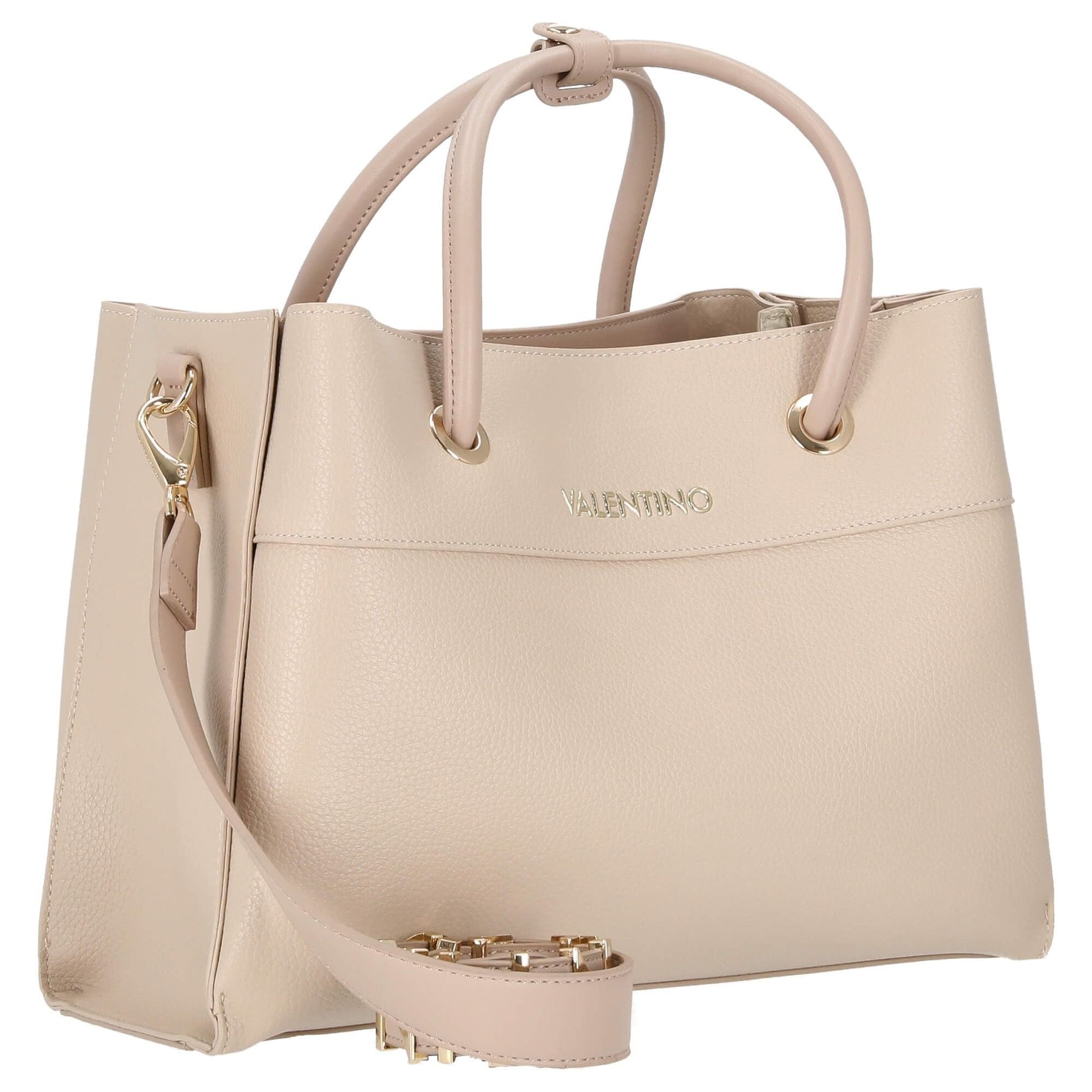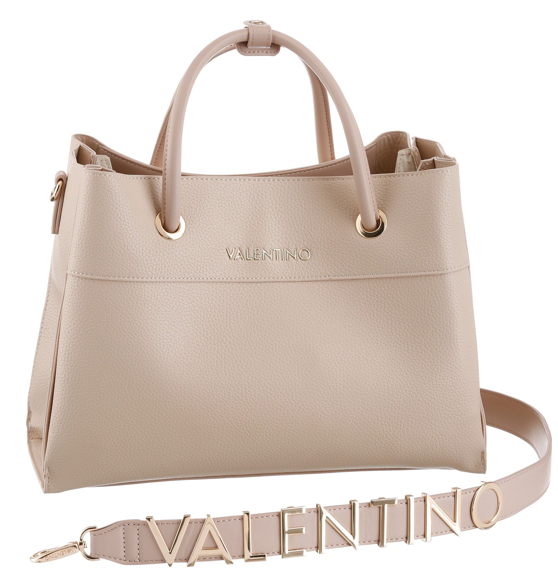 A chic Valentino tote crafted from premium beige leather, featuring a bold wide strap with a metallic VALENTINO logo. A versatile and stylish design perfect for both everyday wear and special occasions.